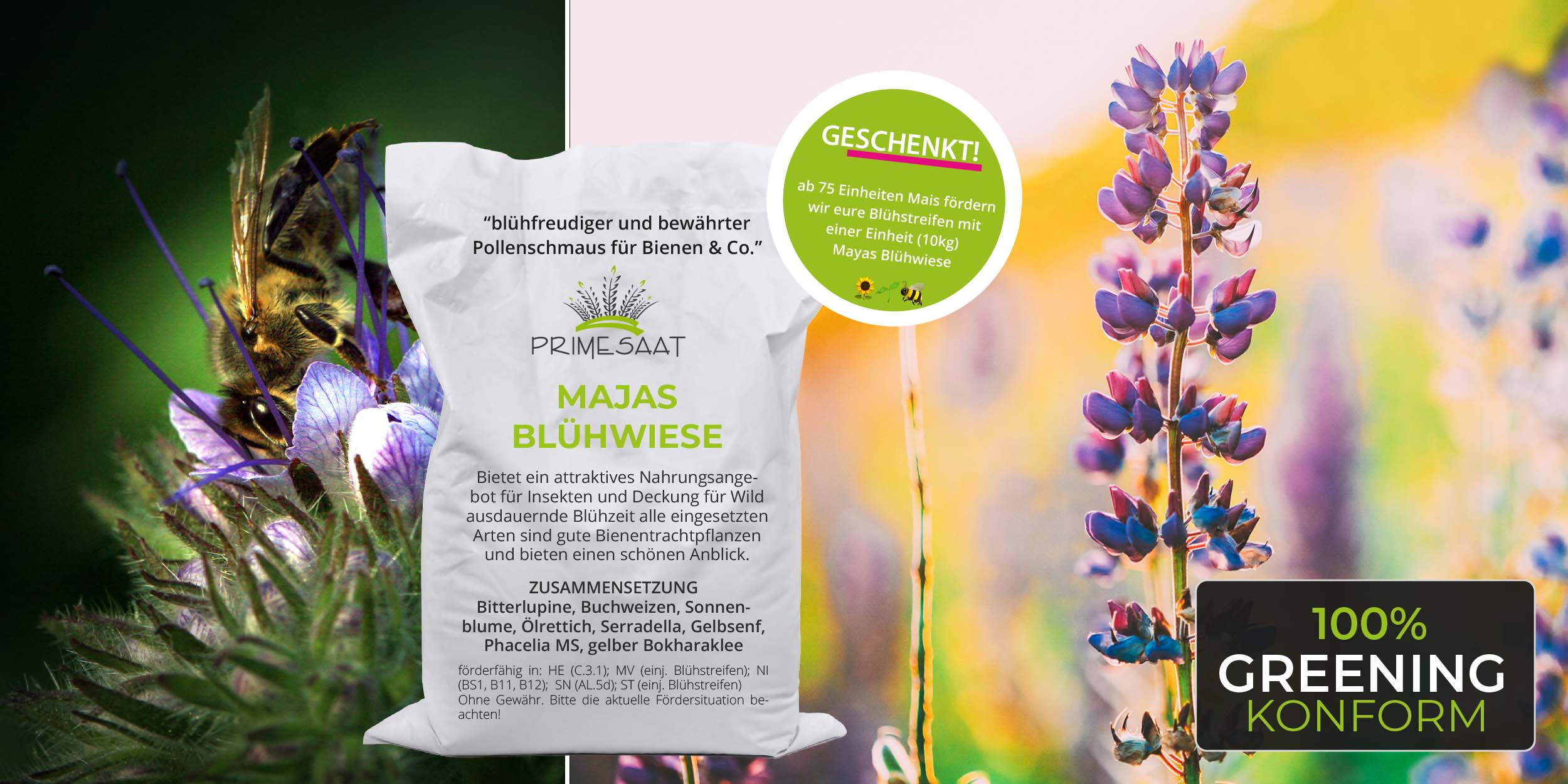 ab 75 Einheiten Mais, fördern wir eure Blühstreifen mit einer Einheit (10kg) Majas Blühwiese